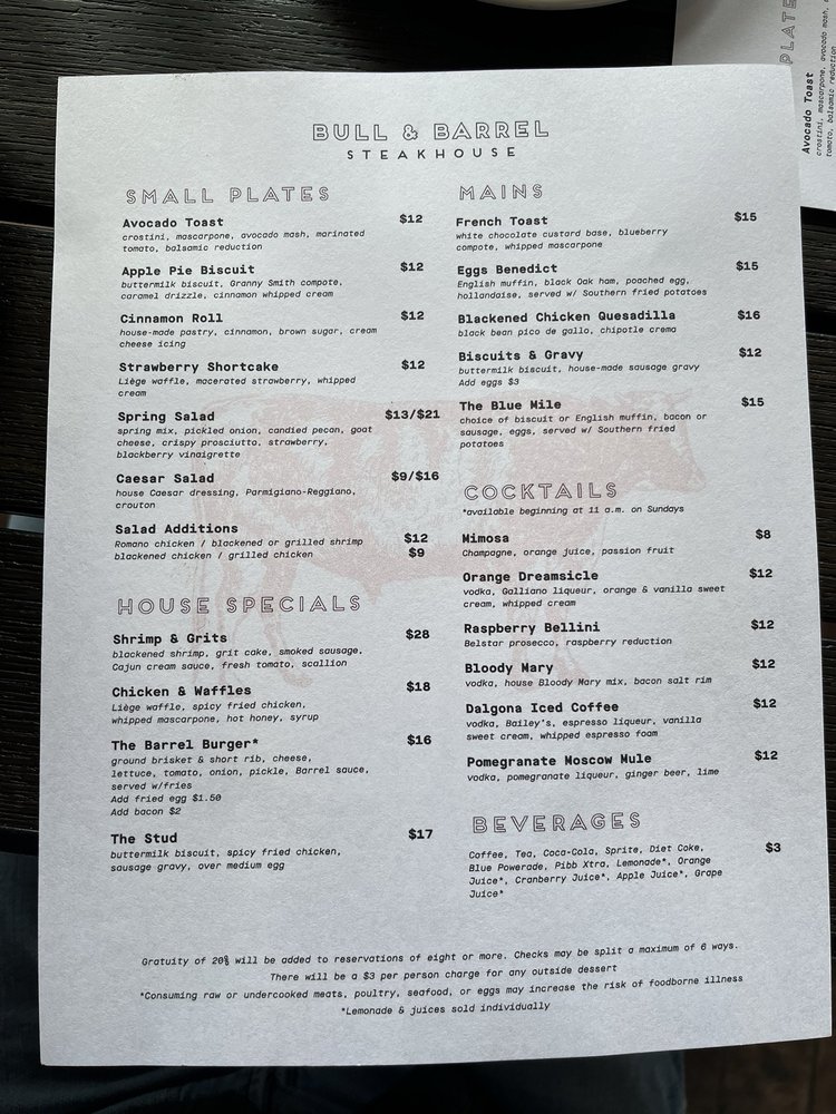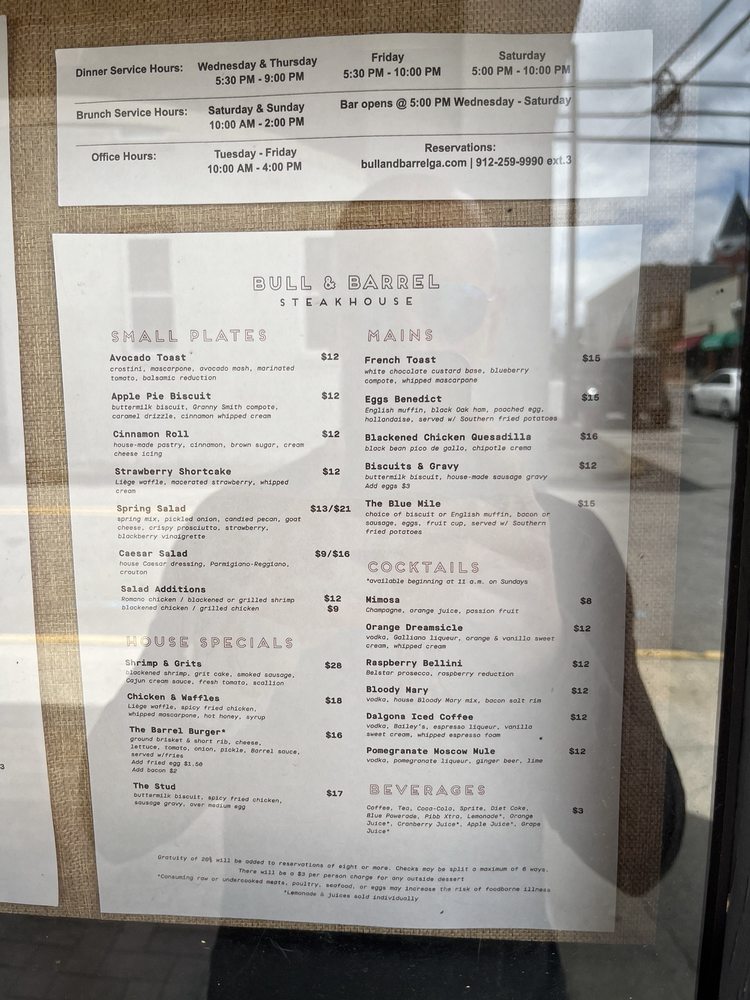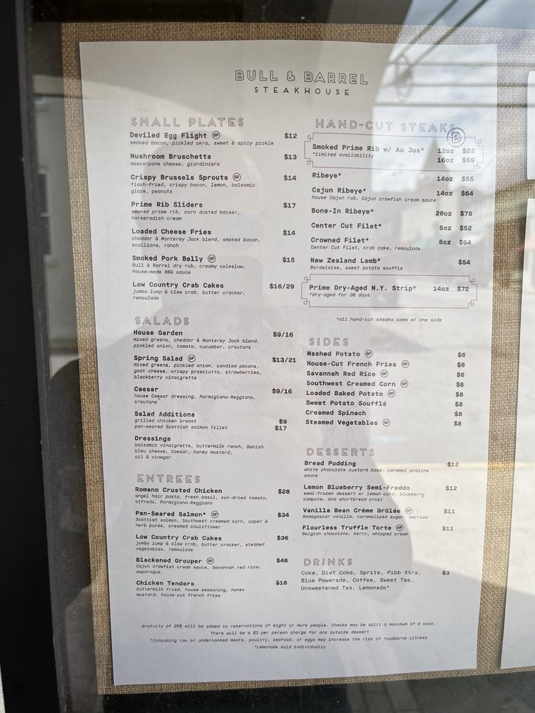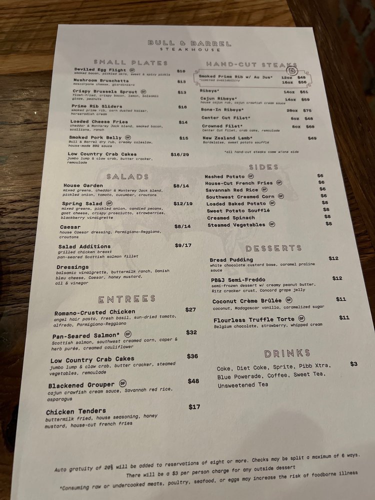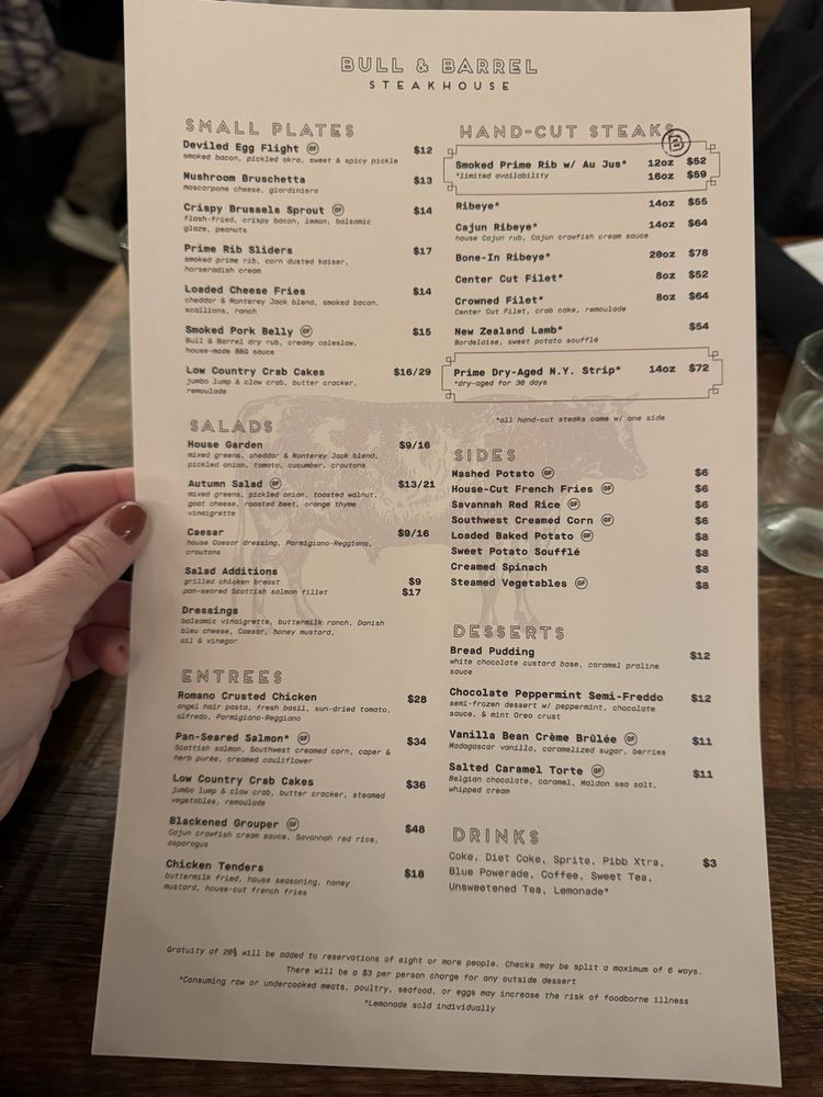 Bull and Barrel Steakhouse in Statesboro, GA delivers a classy dining experience with attentive service and a modern ambiance. The menu boasts a variety of dishes, from center cut filet to romano crusted chicken pasta and ribeye steaks. While some reviews mention slightly overpriced meals, others rave about the quality cocktails, deviled eggs, crab cakes, and desserts like bread pudding and vanilla bean crème brûlée. The restaurant caters to all with takeout options, outdoor seating, and dogs allowed. With a full bar and excellent staff, Bull and Barrel Steakhouse is a top choice for a special date night or a brunch outing. The hand-cut fries, Caesar salad, and loaded mashed potatoes are highly recommended sides to complement your main dish. If you're looking for a unique and flavorful dining experience, Bull and Barrel Steakhouse should be on your list to try.